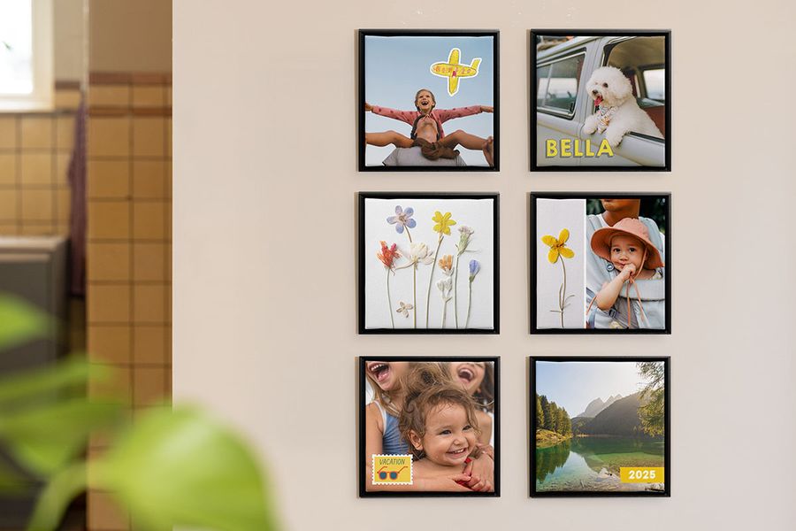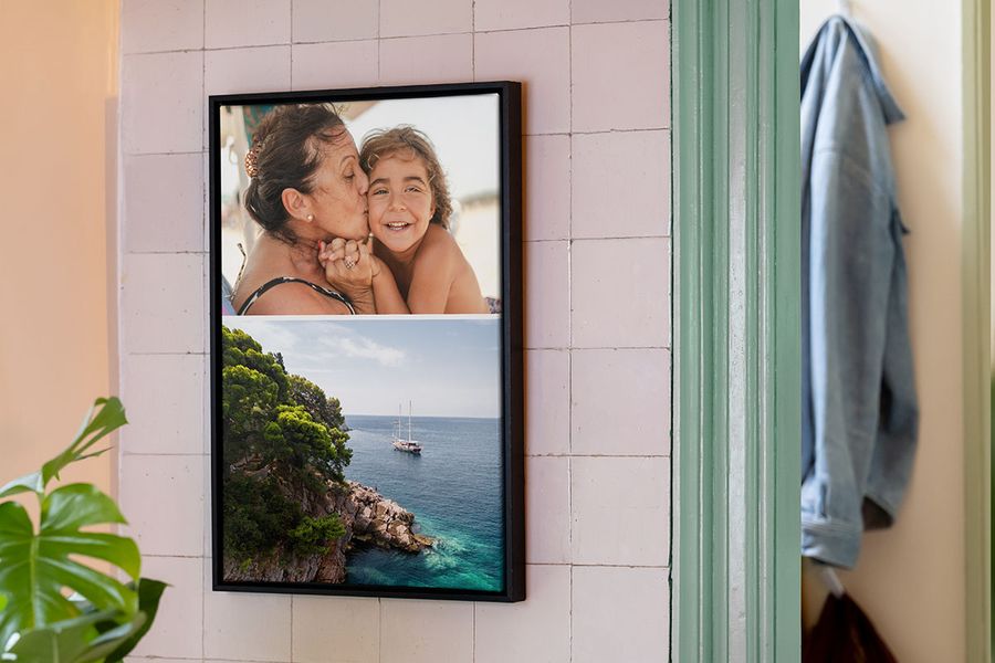 Wil je het compacter? Kies dan voor een fotocollage waarin je meerdere momenten in één wanddecoratie verwerkt, perfect voor een zomerse inrichting zonder je muren vol te hangen.