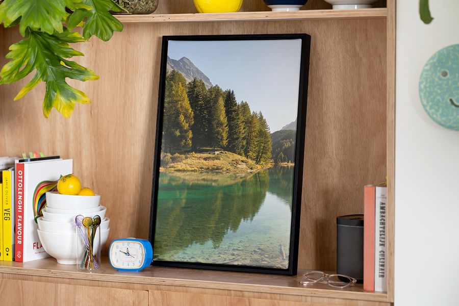 Kies voor de matte textuur van canvas om die natuurlijke, zachte look te behouden. En als je een kleur kiest voor je wanddecoratie, denk dan aan tinten die bij je foto’s passen, zoals blauw-, groen- en aardetinten.