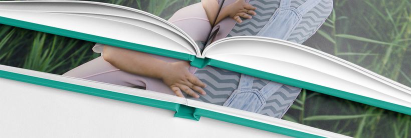 • Fotoboeken met de optie platliggend premium worden zo gedrukt dat de linker- en rechterpagina naadloos in elkaar overlopen