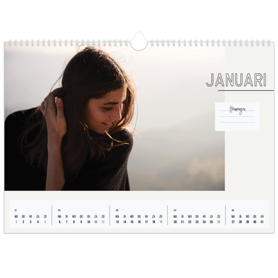 • Fotokalender A3 liggend: wil je groots uitpakken en je foto's in de schijnwerpers zetten? Dan is een kalender A3 liggend de juiste keuze voor jou. Er is veel ruimte voor al je afspraken, zelfs als je een drukke agenda hebt.